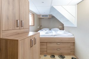 - 12 doppie sul ponte superiore con letto matrimoniale o due letti singoli uniti. Una cabina può diventare tripla con terzo letto a castello