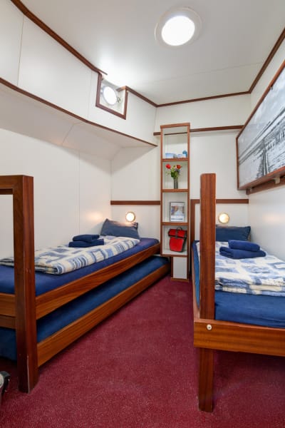 - 2 cabine doppie sopra ponte, che possono diventare triple (con letto a castello) e ospitare 2 adulti + 1 bambino di massimo 16 anni