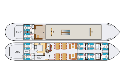 - 4 cabine doppie sotto ponte, che possono diventare quadruple (con letto a castello) e ospitare 2 adulti + 2 bambini di massimo 16 anni