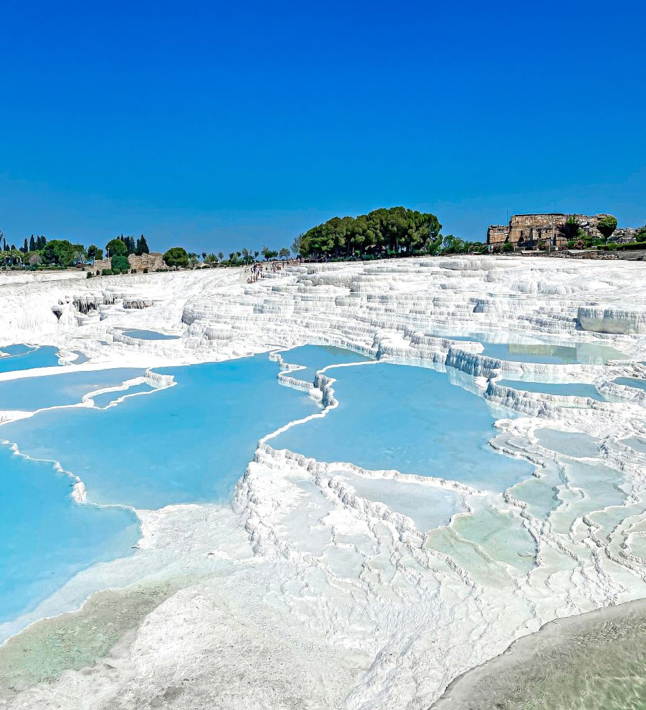 Proseguiamo poi verso Pamukkale per ammirare le celebri terrazze di travertino e visitare l’antico sito di Hierapolis. Pamukkale, che significa “castello di cotone”, è una delle meraviglie naturali della Turchia, con altipiani di un bianco abbagliante e acque azzurre che scendono a cascata su terrazze di minerali carbonatici per oltre 90 metri.